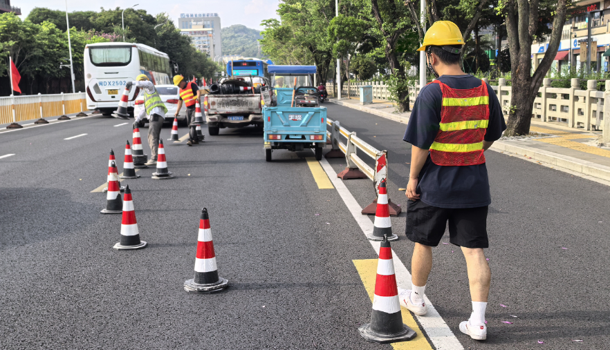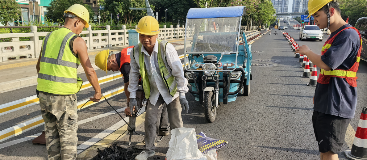 本次演练以工业路47号灯杆附近机动车道路面出现坑洞为背景,整个过程覆盖险情发现、信息上报、应急响应、现场处置和后续恢复等全过程。接到险情报告后,市政中心道管所迅速启动应急预案,组织施工队伍装载警示设备、修复物资等赶赴隐患点,经现场勘察初步判断原因为路面沥青砼老化后,按照规范启动交通安全防护布设,设置病害修复作业区开展紧急修补,并做好后续现场清理等应急措施,有效检验了应急队伍在真实场景下的应急处突能力。